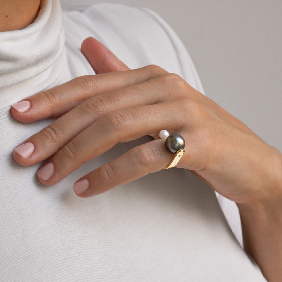 Exquisite ring Maria Theresia decorated with the highest quality Tahitian and freshwater pearls and natural brilliant cut diamond. This unique model is made of 14K yellow gold.