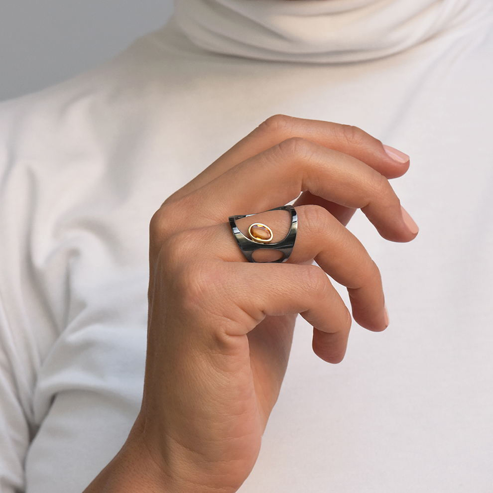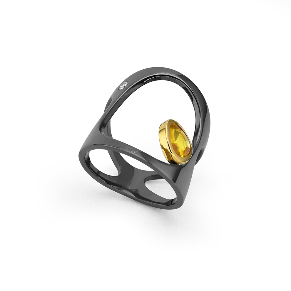 Unique ring made of 14K gold in black rhodium adorned with yellow sapphire and diamond from collection Liberty. Each ring is one-off, you will receive photo documentation of the ring to confirm your purchase.